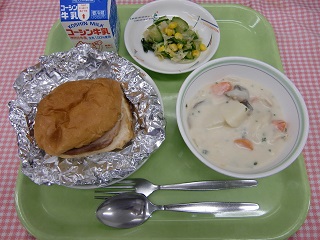 【ハムチーズサンド 人参ドレッシングサラダ ホワイトシチュー 牛乳】