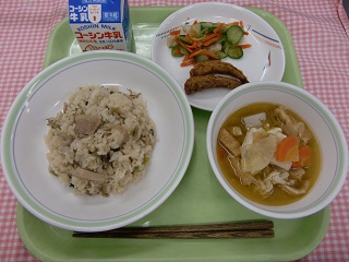 【豚肉とエリンギのご飯 にぎすのサラサ揚げ おひたし みそけんちん汁 牛乳】