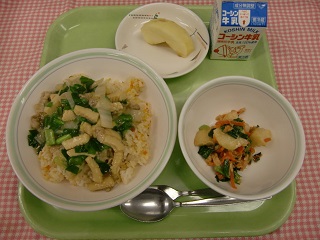 LUNCH TIME通信No.151 公開日 2022/01/26 更新日 2022/01/26 LUNCH TIME 通信 【あんかけチャーハン ツナの甘辛味噌和え 果物(りんご) 牛乳】 「ツナの甘辛味噌和え」のドレッシングには、麻婆豆腐など中華料理の辛さを出す時に使用する、トウバンジャンを使っています。辛さは、辛い物が苦手な人でも食べられるように控えめです。手作りドレッシングの味を味わってください。
