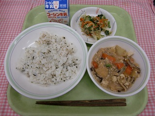 LUNCH TIME通信No.152 公開日 2022/01/27 更新日 2022/01/27 LUNCH TIME 通信 【わかめご飯 じゃがいもと生揚げのそぼろ煮 香味ドレッシングサラダ 牛乳】 今日のそぼろ煮の中に、「糸こんにゃく」が入っていることに気がついた人はいますか?こんにゃくには、種類があり、板状に固めた「板こんにゃく」、板こんにゃくをところてんのように突き出した「糸こんにゃく」などがあります。