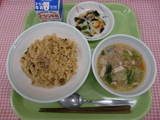 今日から2月です!今月も、リクエストメニューがたくさん登場します♪今日は、「キムチチャーハン」と「ワンタンスープ」がリクエストメニューです。食事のバランスよくサラダも、もりもり食べましょう!