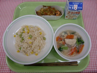 LUNCH TIME通信No.168 公開日 2022/02/21 更新日 2022/02/21 LUNCH TIME 通信 【彩り茶飯 鮭のちゃんちゃん焼き 吉野汁 牛乳】 今日の汁物には、下味をつけた鶏ささみ肉に片栗粉をまぶしたものが、入っています。そうすることで、お肉がやわらかい食感になります。また、鶏ささみ肉は、脂肪が少なく、たんぱく質が豊富な食品です。