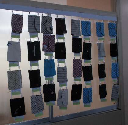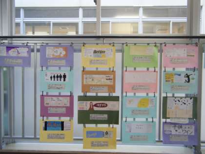 総合作品展の写真です。 美術科で作成したペットボトルラベルと家庭科で作成したブックカバーです。