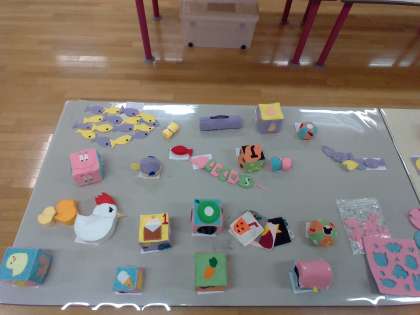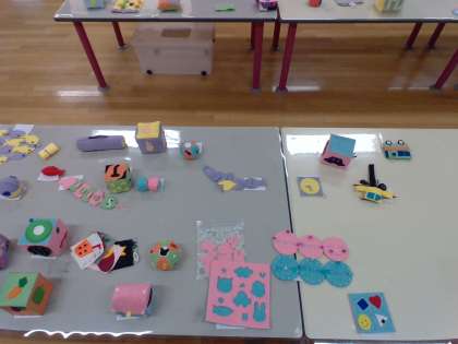 家庭科では、幼児のおもちゃを作りました。かわいらしい人形や手の込んだ小物が並んでいます。