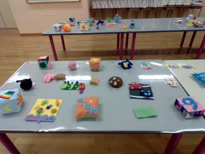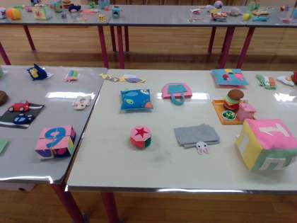 家庭科では、幼児のおもちゃを作りました。かわいらしい人形や手の込んだ小物が並んでいます。