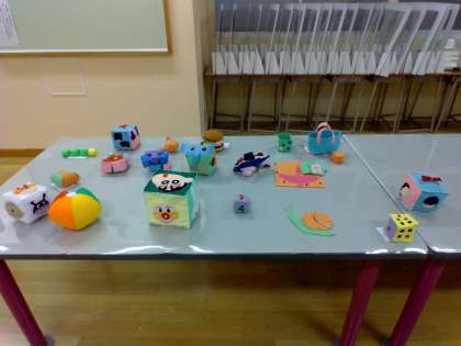 家庭科では、幼児のおもちゃを作りました。かわいらしい人形や手の込んだ小物が並んでいます。