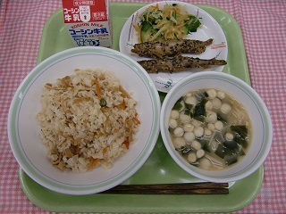 【こぎつねご飯 ししゃものごま揚げ 野菜の南蛮ソース みそ汁 牛乳】