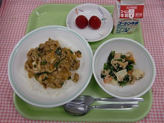 LUNCH TIME通信No.186 公開日 2022/03/24 更新日 2022/03/24 LUNCH TIME 通信 【豚キムチ丼 ツナサラダ 果物(いちご) 牛乳】 いちごは、冬から春にかけてお店に並びます。代表的な品種に、栃木県の「とちおとめ」、福岡県の「あまおう」、静岡県の「紅ほっぺ」があります。今日のいちごは、「あまおう」です!今年度、ラストの給食を楽しんでください!
