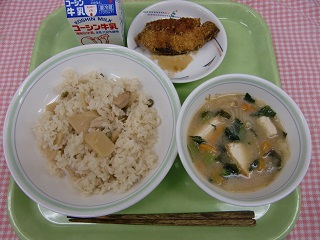 LUNCH TIME通信No.10 公開日 2022/04/21 更新日 2022/04/21 LUNCH TIME 通信 【たけのこご飯 あじフライ みそ汁 牛乳】 今日は、4月〜5月に旬を迎える、たけのこを使ったご飯です。たけのこは、竹の若い芽を掘り起こしたものです。たけのこの香りや味を楽しみましょう!