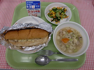 LUNCH TIME通信No.19 公開日 2022/05/10 更新日 2022/05/10 LUNCH TIME 通信 【ジャーマンポテトパン バジルドレッシングサラダ マカロニ野菜スープ 牛乳】 今日のサラダのドレッシングには、オリーブ油を使用しています。オリーブ油は、オリーブの実からとれる油で、特有の香りとうまみがあります。また、オリーブの葉はお茶にして飲むこともあります。