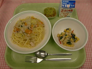 【キャベツのスープパスタ カラフルサラダ 抹茶チーズケーキ 牛乳】