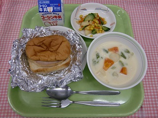 LUNCH TIME通信No.31 公開日 2022/05/26 更新日 2022/05/26 LUNCH TIME 通信 【ハムチーズサンド ハニーサラダ アスパラのクリームスープ 牛乳】 皆さんは、グリーンとホワイトアスパラガスの違いを知っていますか?グリーンアスパラガスは、光に当てて栽培したもので、ホワイトアスパラガスは土をかぶせて光を遮って栽培したものです。今日は、山形県最上町のグリーンアスパラガスを使った、とれたて村給食です!