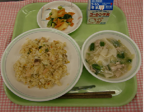 今日のチャーハンの鮭は、前にも紹介をした「スチームコンベクションオーブン」を使って、蒸し焼きにしています。やわらかい鮭を、なるべく形を崩さないように、調理員さんが丁寧に混ぜ合わせて、チャーハンを作りました!