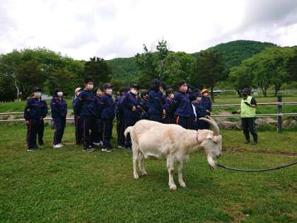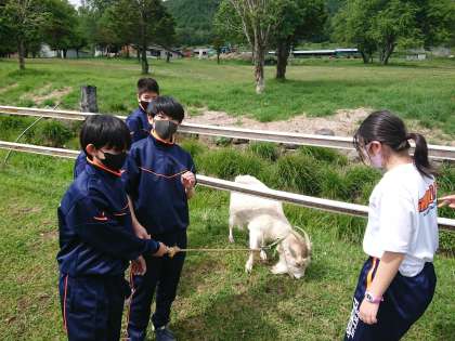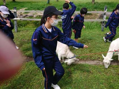 ヤギ散歩をしています。でもヤギに散歩されている班もあるようです。