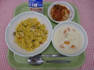 LUNCH TIME通信No.52 公開日 2022/06/24 更新日 2022/06/24 LUNCH TIME 通信 【パエリア 鶏肉のトマトソースがけ コーンクリームスープ 牛乳】 トマトのうまみ成分は、グルタミン酸で、昆布と同じ成分です!今日は、山形県最上町の新鮮なトマトを味わってください!