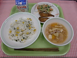 【コーンわかめご飯 はたはたの唐揚げ ごぼうの和え物 豚汁 牛乳】