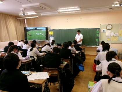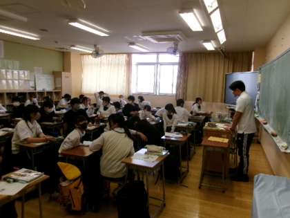 8年生保健体育では、タグラグビーの基本を学習していました。教育実習の先生からは、安心して安全に競技に取り組むための心構えを教えてもらいました。