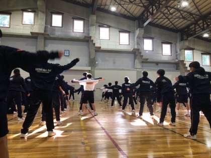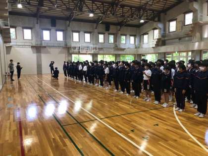 時間通りに集合し、朝の集会が行われています。みなさん、元気な様子です。日差しが出てきました。