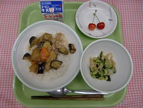 【なすと鶏肉の甘辛丼 ねぎ味噌和え 果物(さくらんぼ) 牛乳】