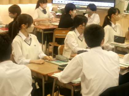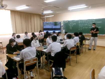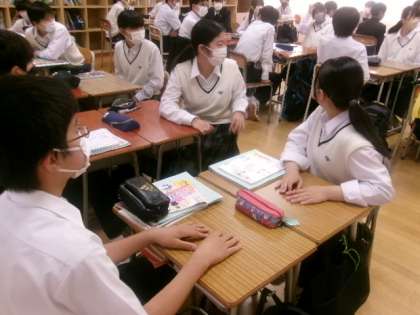 8年生英語では、前回の文法事項の内容を受けて、2人1組ペアになってスピーキングの練習を行っていました。