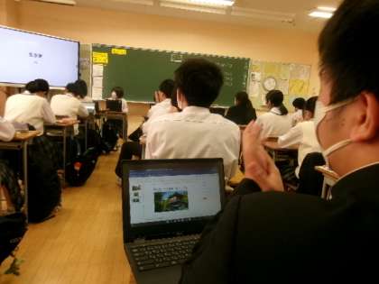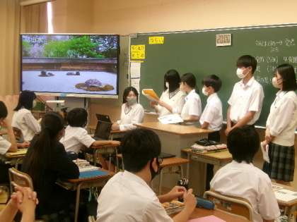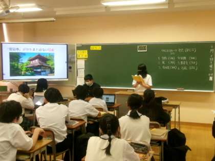 8年生社会 公開日 2023/06/19 更新日 2023/06/19 できごと 8年生社会では、歴史的分野のうち室町時代の文化(北山文化・東山文化)について学習していました。 共通課題として『能』を取り上げ全体で学習した後、鹿苑寺金閣、慈照寺銀閣、東求堂同仁斎、石庭、茶の湯、というように班ごとに選択し、整理・分析した内容を発表していました。受動的に「聞く」授業ではなく、主体的に課題に取り組む姿が見られました。
