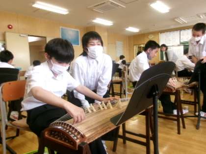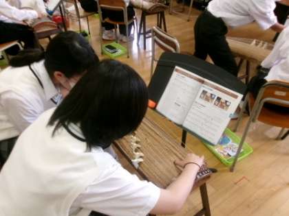7年生音楽 公開日 2023/06/20 更新日 2023/06/20 できごと 音楽の授業では、すべての学年で『箏(そう)』を学習しています。 伝統的なお琴を扱う授業では、「さくらさくら」の楽曲を奏でていました。指で元気にはじく音が響いていた一方で、強弱をつけるのが難しそうに見えました。