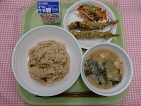 【茶飯 ししゃもののりごま揚げ おひたし みそ汁 牛乳】