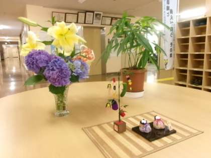 間もなく7月。玄関には、用務主事さんが毎朝、お手入れしてくれている季節のお花や年中行事の飾り物が置かれています。