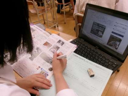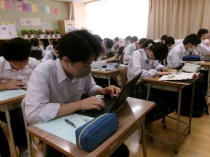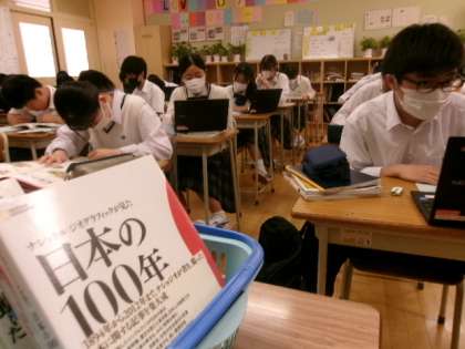 定期考査後のこの日は、大きなテーマに沿って個々が課題を設定し、タブレットや書籍(教科書、資料集、図書資料)等を活用して整理・分析し、レポートにまとめる活動でした。修学旅行や道徳などで自身の思考を表現する技能を獲得していることもあり、スムーズに学習が進んでいました。