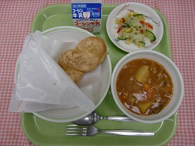 LUNCH TIME通信No.57 公開日 2023/07/05 更新日 2023/07/05 LUNCH TIME 通信 【きな粉揚げパン オニオンドレッシングサラダ ハンガリアンシチュー 牛乳】 今日は、給食で人気メニューの1つ、揚げパンです!パンを、外側はサックリ、中はふんわりと揚げることは、なかなか難しい調理ですが、みなさんが楽しみにしてくれていることを励みに調理員さんがはりきって作ってくださりました!