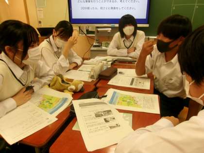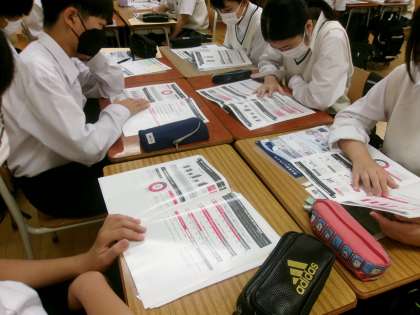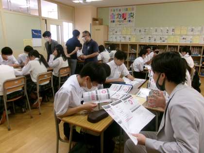 8年生職場体験学習1 公開日 2023/07/06 更新日 2023/07/06 できごと 本日、8年生では、校内で職場体験学習を行いました。 実際の店舗での体験実習を改め、起業家精神を高めるアントレプレナーシップの視点から、教室を企業経営のオフィスと見立て、多様な環境条件から経営戦略を立てる手法で学習を深めました。 この様子は、後日、新聞でも取り上げられるようです。