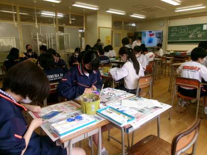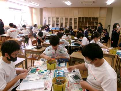 8年生美術 公開日 2023/07/14 更新日 2023/07/14 できごと 8年生美術では、絵画の制作を行っていました。今日は、スパッタリングの手法で、様々な図形を組み合わせた抽象画のようでした。 決められた構図があるわけではないので、生徒一人一人の個性が反映された図形、絵柄、色などの表現がなされていました。