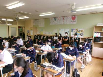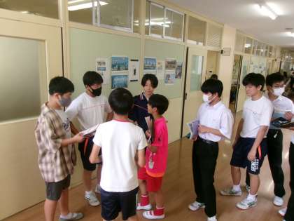 6年生のみなさんは、生徒会本部役員が準備したクロスワードパズルを解きながら、中学生の授業を意欲的に見学していました。中学校生活のイメージを少しでももってくれたらありがたいです。休み時間には、小中学生が談笑する場面も見られました。