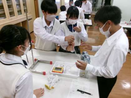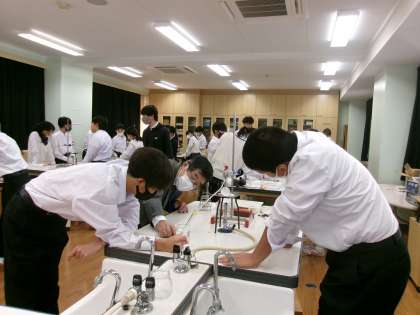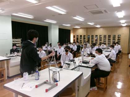 今日は、実験器具を活用して、エタノールを抽出しました。この実験の意味が示すことを考えながら、授業が進みました。