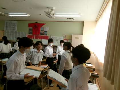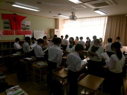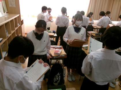 相手の表情を見て 公開日 2023/11/24 更新日 2023/11/24 できごと 7年生英語では、4技能(話す・書く・読む・聞く)をバランス良く習得しています。 今日は、日常会話を中心に、ペア学習で対話を重ねていました。はじめ、課題プリントを見ながら話していた生徒も、回数を重ねる度に、次第に他者の表情を見ながら対話することができるようになっていました。