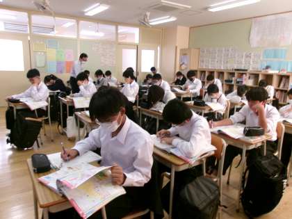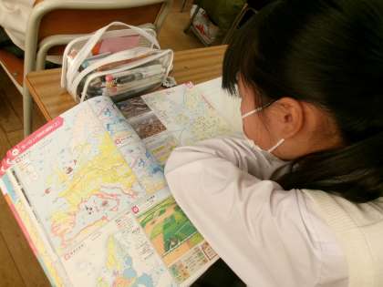 はじめ、地図帳の資料から気付いたこと、読み取ったことを個別にまとめ、その後、グループになって意見を交流しました。仲間の発言をきっかけとして、自分が気がつかなかった視点を整理できたようでした。