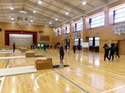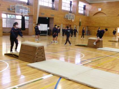 基本が大事 公開日 2024/02/14 更新日 2024/02/14 できごと 8年生保健体育では、器械体操で跳び箱を行っています。 今日は、跳ぶときの姿勢に重点を置き、体重移動や重心、飛び板との連動などを想定しながら、基本から練習しました。単元の最後にタブレットで撮影するため、着地の姿勢も意識した練習が始まりました。