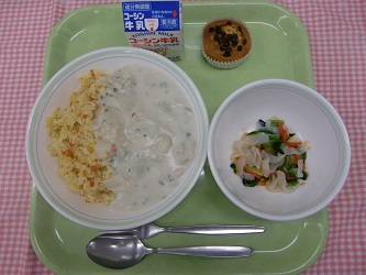 LUNCH TIME通信No.166 公開日 2024/02/19 更新日 2024/02/19 LUNCH TIME 通信 【カレーピラフきのこクリームソース こんにゃくサラダ チョコチップケーキ 牛乳】 クイズです!世界三大珍味の1つにもなっている「きのこ」は、どれでしょうか? 1 まつたけ、2 マッシュルーム、3 トリュフ 正解は、3 トリュフです。 ※世界三大珍味は、トリュフ、キャビア、フォアグラです。 ★給食リクエスト★ <チョコチップケーキ>7年6組