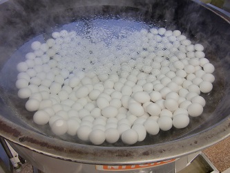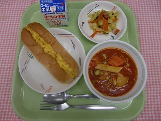 今日は、サンドウィッチの中でも人気のある「卵サンド」です!卵サンドの具材は、全て給食室手作りです。23.5kgの卵(約336個)を朝からゆで卵にし、殻をむいて作りました!おいしく食べてもらえると嬉しいです。