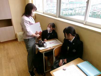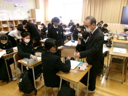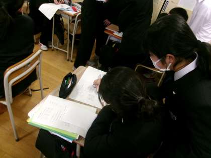 7年生数学では、先日行った「定期テスト対策テスト」の解き直しを行っていました。難易度の高い問題は、解法をお互いに確認し合う「学び合い」が教室中に見られました。