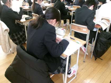 今日から学年末考査 公開日 2024/02/27 更新日 2024/02/27 できごと 本日より、学年末考査が始まります。 今日は、いつもより早く登校して教室で学習する生徒が多くいました。1時間目の自習の後、理科、音楽、美術の3教科の試験が行われます。