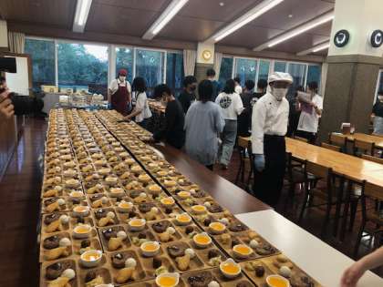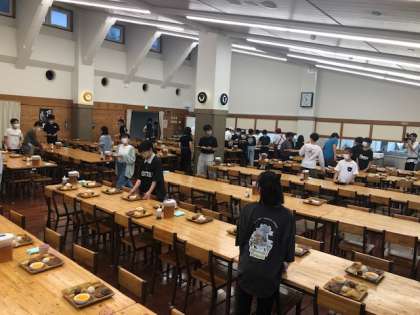 入浴が終わり、食事係が200名を超える食数を丁寧に準備してくれています。まもなく、いただきますの時間です。