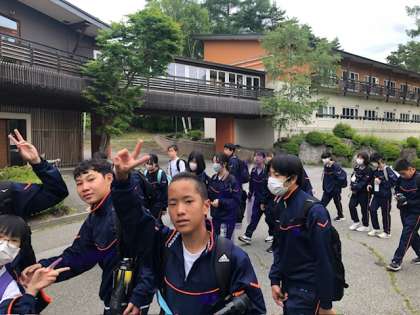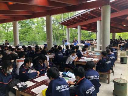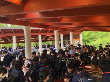 野外炊事がこれから始まります。天気は曇り、半袖だと涼しく感じる気温です。
