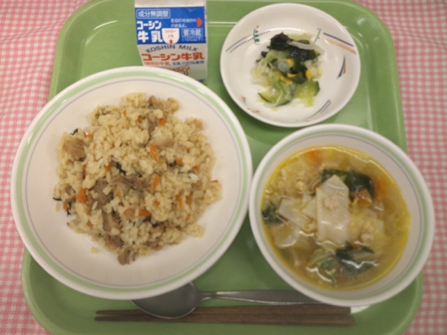 【釜焼きビビンバ、わかめサラダ、ワンタンスープ、牛乳】