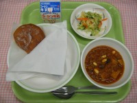 【シュガー揚げパン、フレンチサラダ、チリコンカン、牛乳】 チリコンカンは、豚肉や...