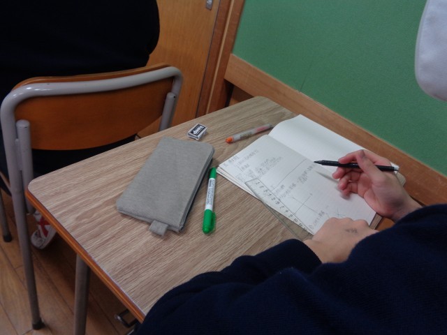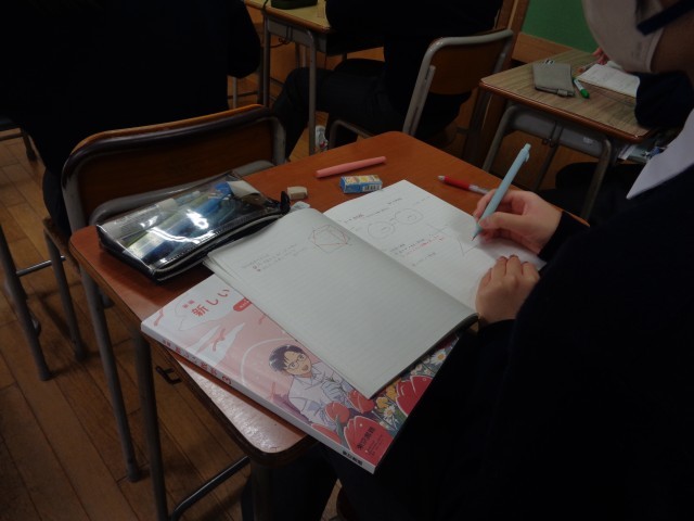 5時間目の9年1、2組の数学少人数の授業では、これまでの作図の復習を行いました。垂直二等分線などノートに書いたり、教科書で確認をしました。都立入試では、作図の問題は出題されるということもあり、受験生として真剣な眼差して授業を受けていました。