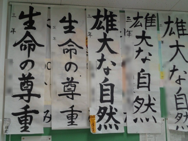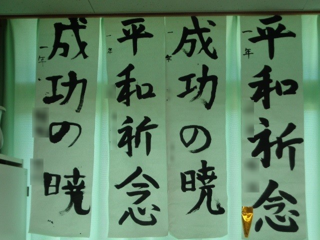 生徒たちは、冬休み中に取り組んだ書初めを休み明けに提出し、全ての作品は各教室に掲示されました。優れた作品には、金賞、銀賞、銅賞が授与されたことを示す札が付けられ、掲示されました。どの作品も、生徒たちの努力と個性が感じられ、新年の教室の雰囲気を盛り上げています。
