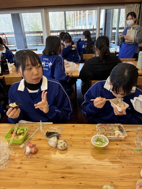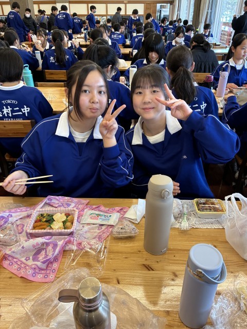 食堂に移動して昼食です。朝早起きしてお弁当作り、ありがとうございます。