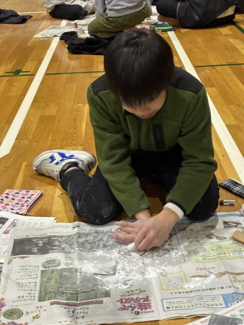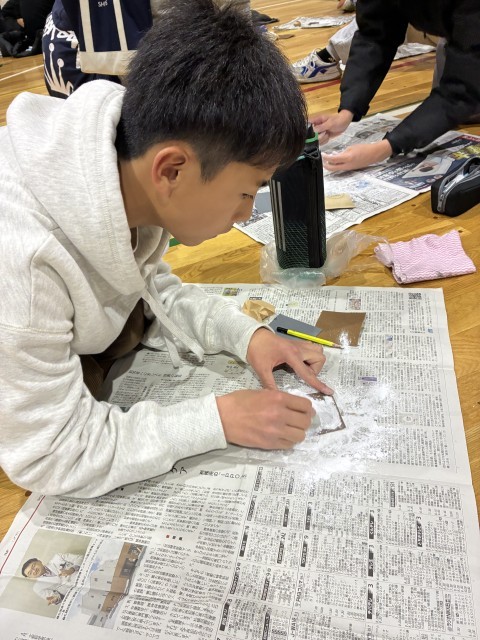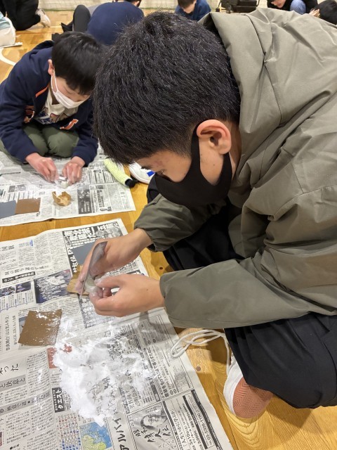 しゃべらず集中して、紙やすりです磨いています。