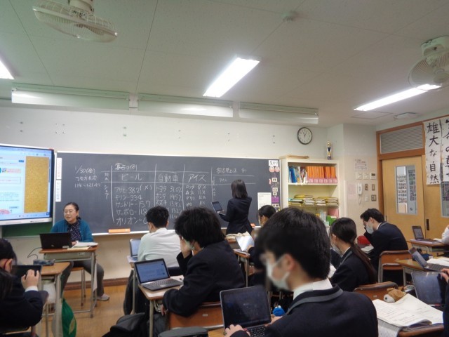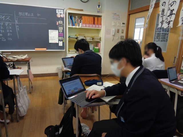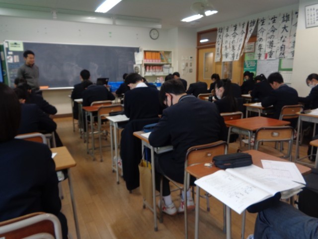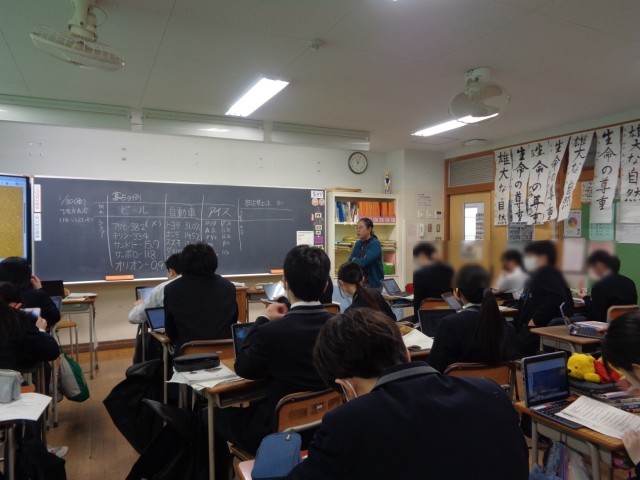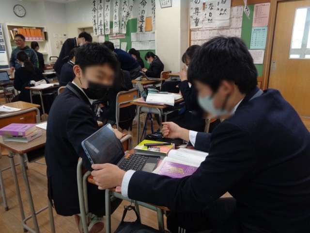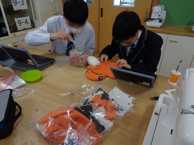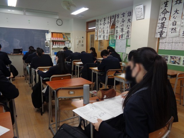 3時間目の9年生の授業の様子を紹介します。9年1組の国語の授業では、島崎藤村の「初恋」について学習しました。登場人物の2人の距離が徐々に縮まる様子をペアなどで話し合いながら進めていました。9年2組の社会の授業では、企業の競争と独占について身近な企業を例にして「寡占」や独禁法について、学習を深めることができました。9年3組の家庭科の授業では、手人形を制作しました。文化発表会展示の部で展示される予定です。9年4組の理科の授業では、都立入試に向けて模擬問題を解いていました。生徒の中には一昨日、昨日と都立推薦を受けた生徒もいましたが、疲れた様子は見せずに、ほっとした表情で学習活動に取り組んでいました。